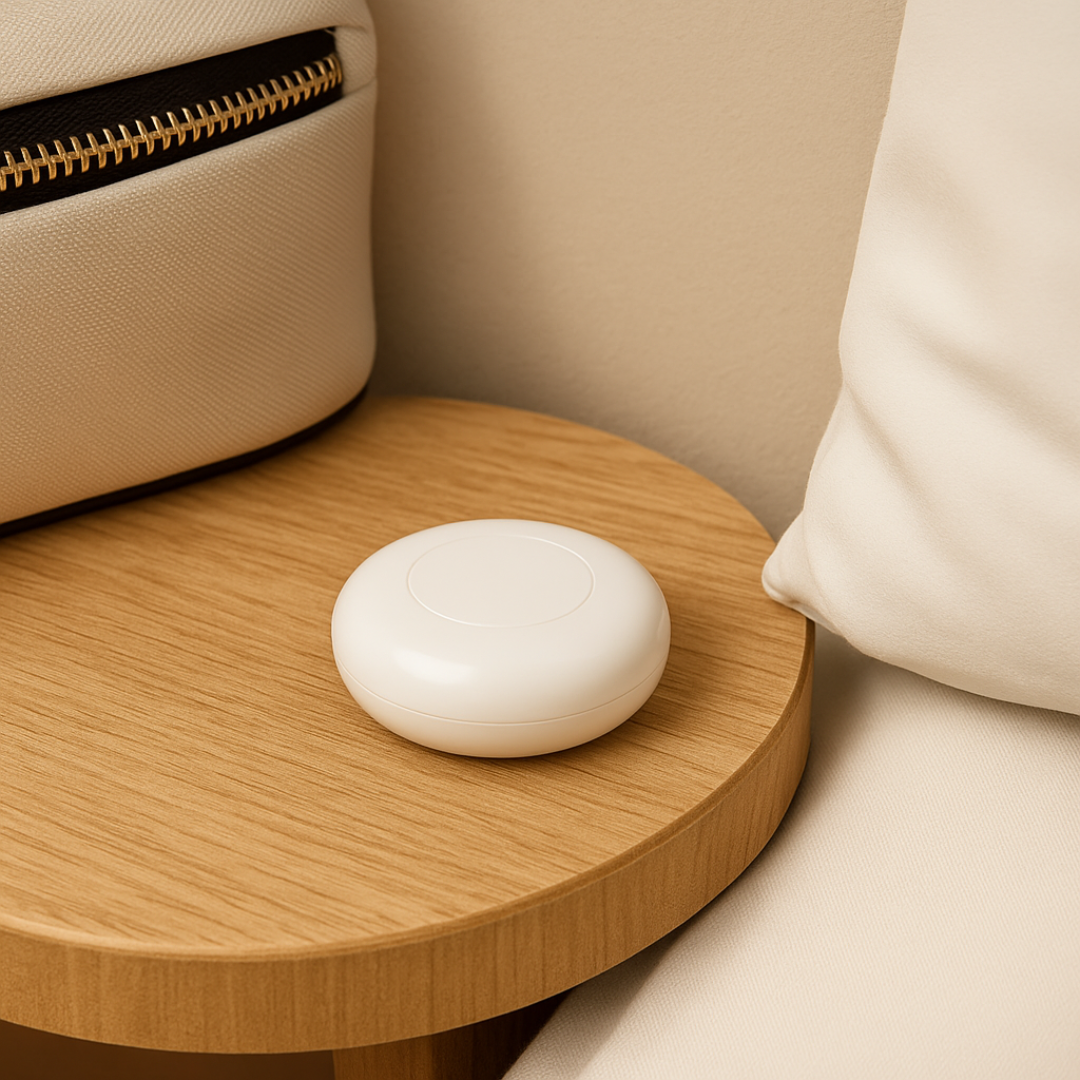 Étui rond ~4 cm de diamètre : se glisse dans la table de chevet, un sac ou une trousse de voyage.