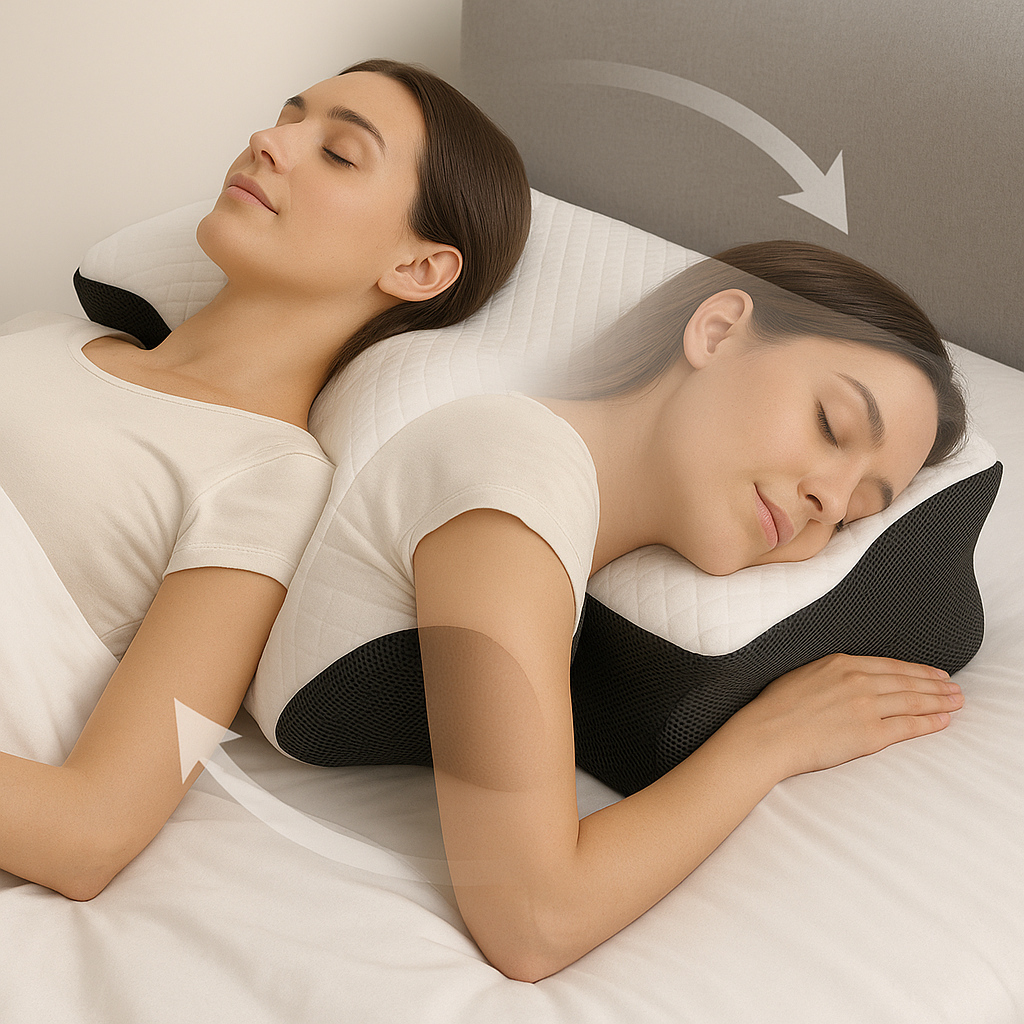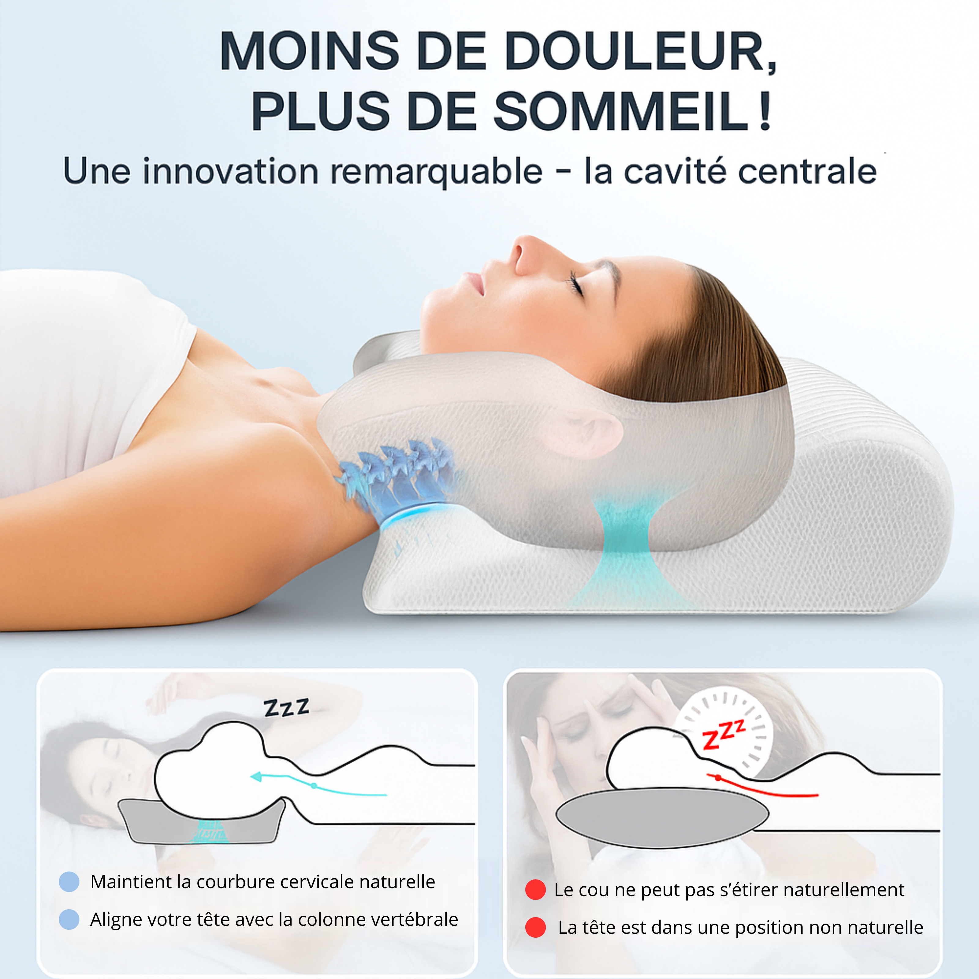 le creux cervical guide la nuque dans l’axe, limitant l’hyperflexion/extension ; beaucoup d’utilisateurs rapportent moins de raideur après quelques nuits.