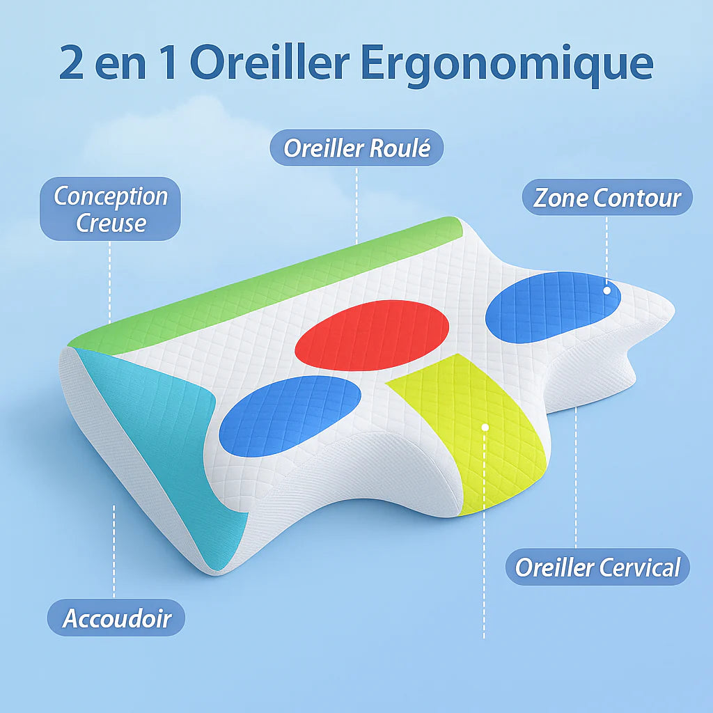 • Type : oreiller ergonomique mémoire de forme 2-en-1 (creux cervical + double hauteur).